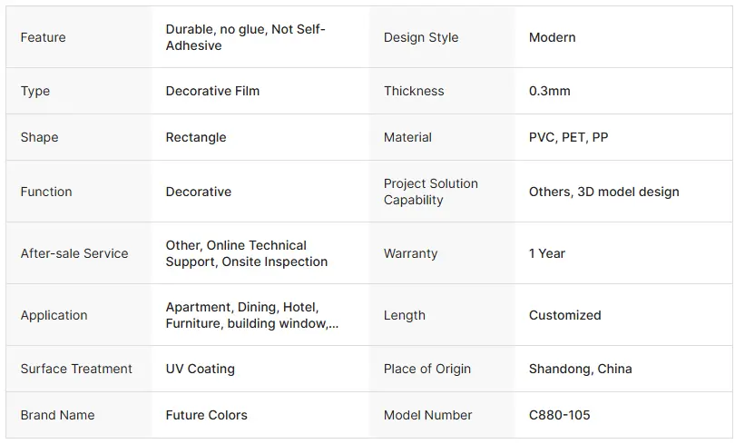 Le film moderne de couleur unie en couleur unie est un matériau de film décoratif qui utilise du plastique moléculaire élevé comme matériau de base. Après le traitement des colorations et du revêtement, il atteint l'adhésion par le "processus des cloques" (moulage d'adsorption de vide). Il dispose de "couleur uniforme, de plasticité forte et de rentabilité élevée" et est largement utilisé dans des champs tels que les meubles, la décoration et l'emballage. C'est l'un des matériaux couramment utilisés dans la conception de style minimaliste moderne.